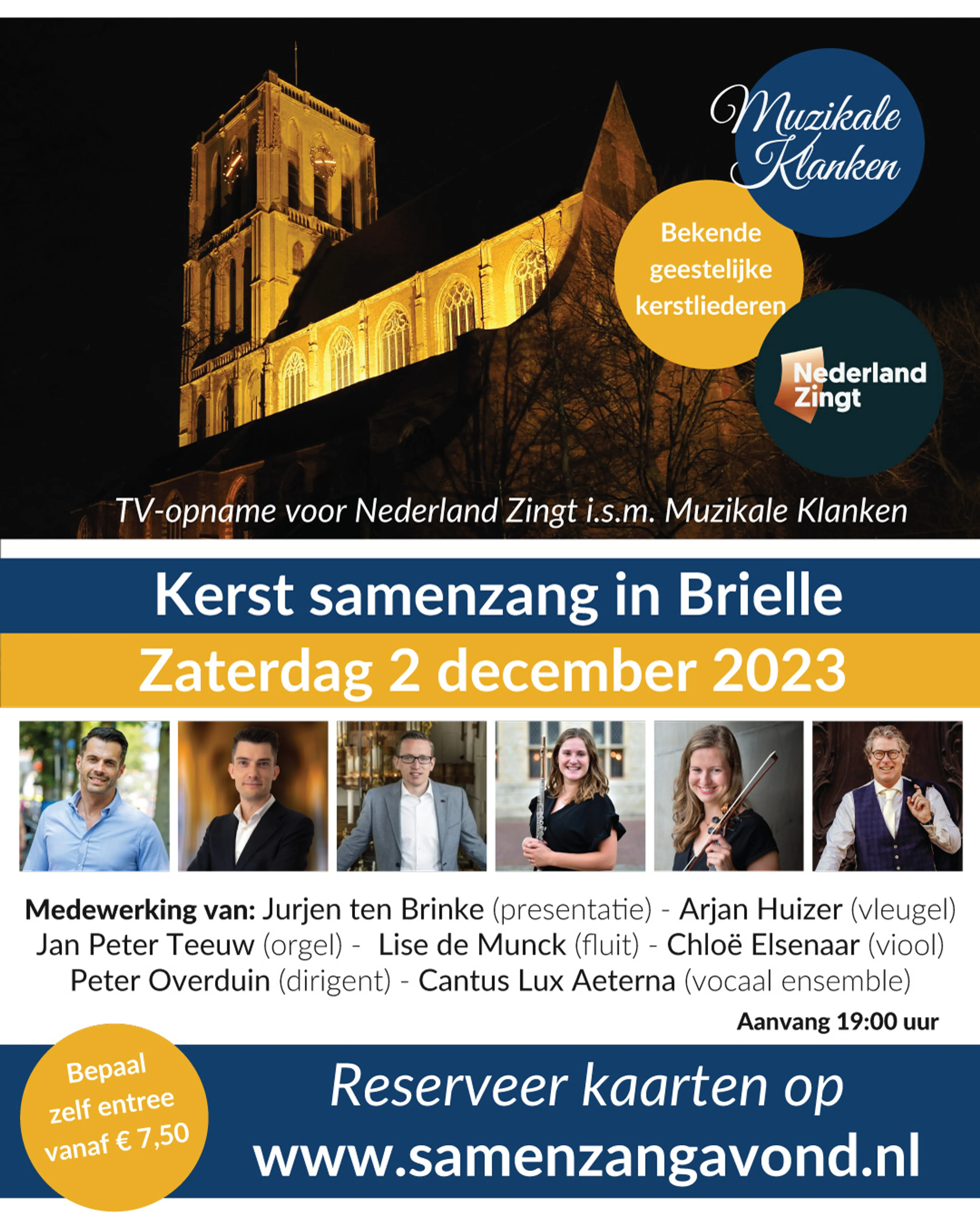 'Komt allen tezamen', 'Go tell it on the mountain' en 'Ere zij God'. Het zijn een paar titels van prachtige Kerstliederen die zullen klinken. Tijdens deze samenzangavond worden er tv-opnames gemaakt voor Nederland Zingt op Zondag. Op 1ste Kerstdag wordt deze Kerst-kerkdienst uitgezonden op tv, om 10.00 uur op NPO2. Deze Kerst samenzangavond is een samenwerking van Muzikale Klanken en EO Nederland Zingt.